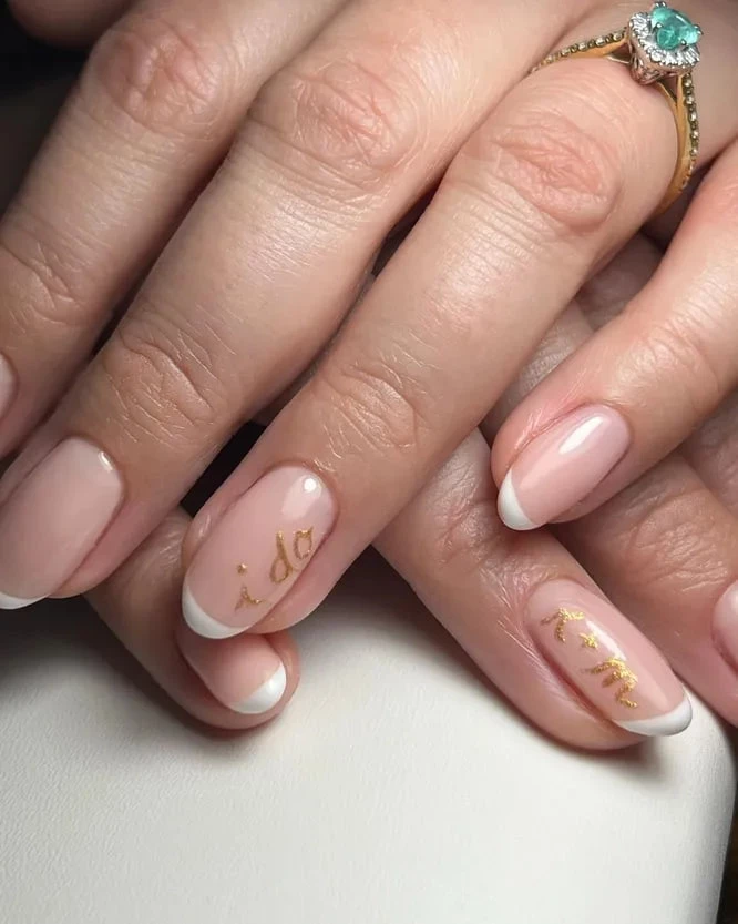 Нежные нюдовые тона, золотистые элементы и символичные детали — вот рецепт идеального свадебного маникюра 2024 года. На безымянном пальце можно сделать акцент: инкрустацию, надпись «Да!» или изящный золотой узор. Это не только красиво, но и придает маникюру особое значение. Пусть важный момент будет отмечен блестящими деталями!