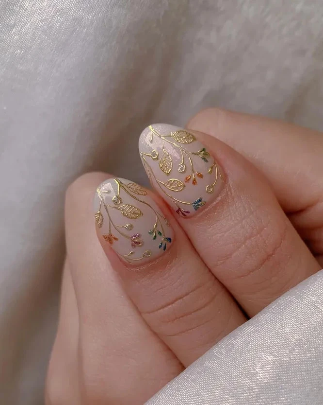 Растительные мотивы, выполненные в технике ручной росписи и дополненные тонкими золотыми линиями, превращают ногти в миниатюрные картины. Это один из самых сложных и впечатляющих видов нейл-дизайна. Он требует мастерства, но результат стоит затраченных усилий. Если хочется чего-то действительно уникального — это ваш вариант.
