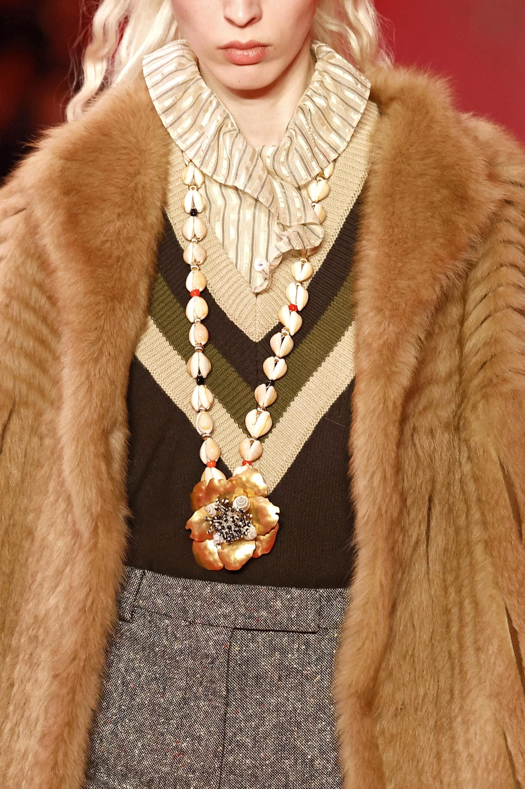 - Многослойность — сочетание нескольких массивных ожерелий, добавляющее этнические и бохо-нотки.