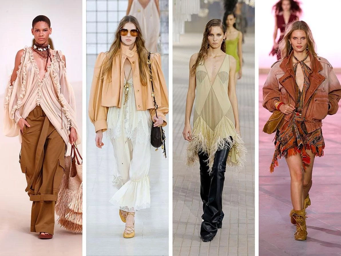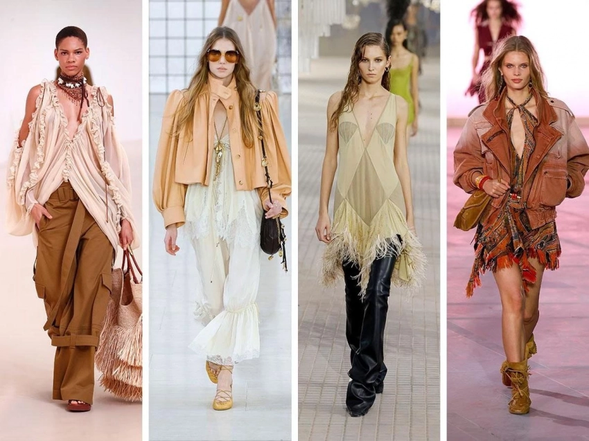 Романтичные образы с бахромой, рюшами и натуральными оттенками вернулись благодаря Chloé. Их дополнением станут массивные украшения и грубая обувь. Легкие воздушные ткани, этнические мотивы, объемные рукава и асимметричные кройки подчеркнут богемный стиль. Важно сочетать элементы бохо с современными аксессуарами, чтобы создать актуальный образ.
