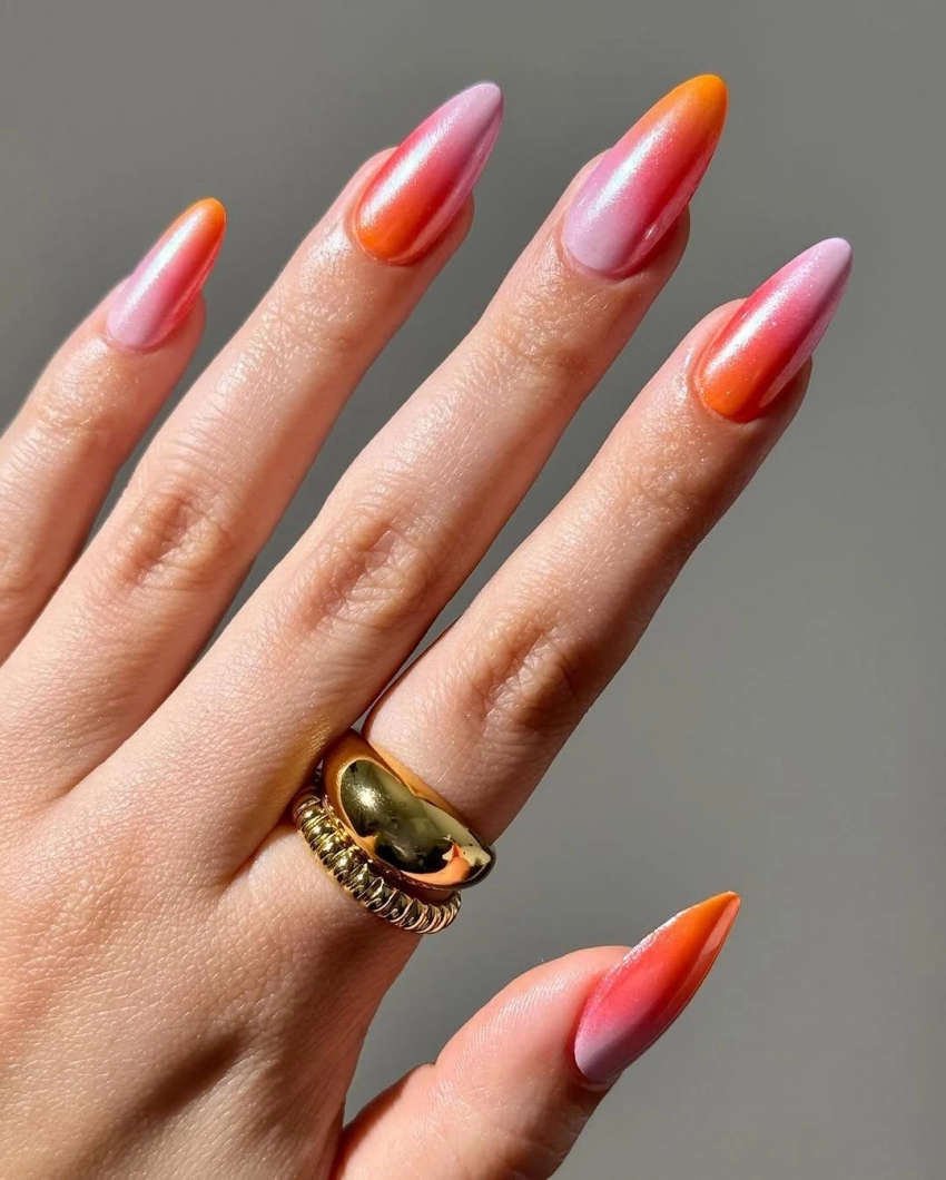 Если не можете выбрать один оттенок для маникюра, выберите технику омбре. С плавным переходом от одного цвета к другому этот дизайн создает интересный и многогранный эффект. Нейтральный оттенок в сочетании с ярким цветом привлечет внимание и усилит энергетический эффект маникюра.