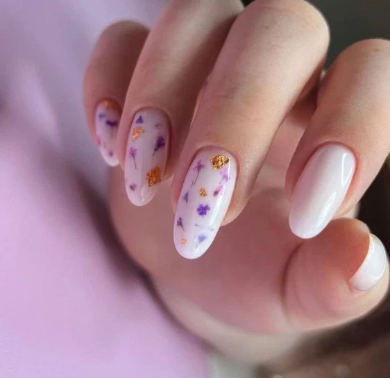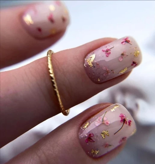 Маникюр с сухоцветами и золотом напоминает ювелирное украшение — идеальное решение для свадьбы или вечеринки. Тонкая золотая полоска, хаотичная фольга или мерцающая пудра между лепестками придают дизайну шик.
